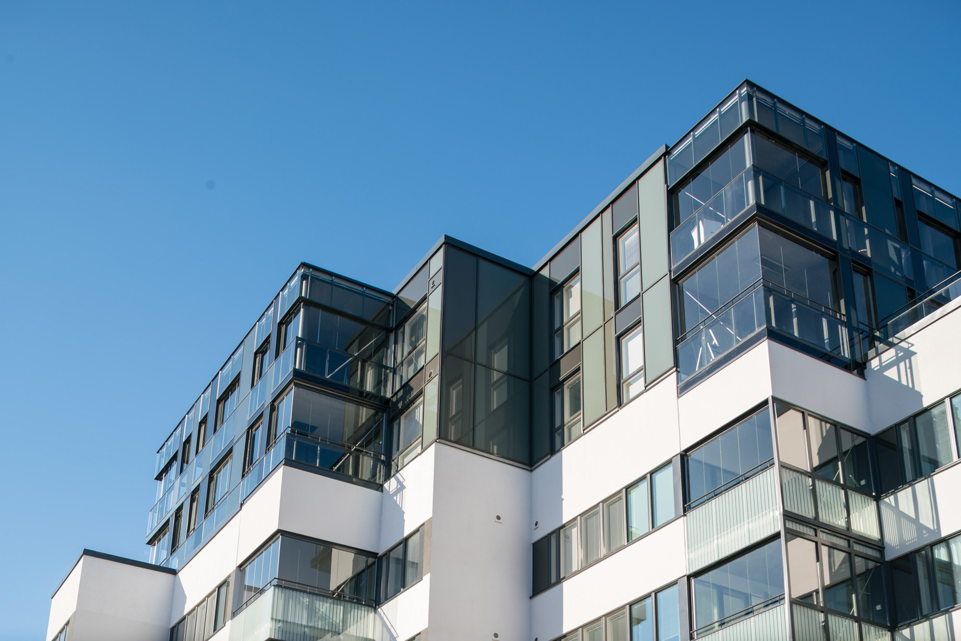 Asuntojen yhteistilat sijoitettiin maantaso- ja kellarikerrokseen. Pääasialliseksi julkisivumateriaaliksi valikoitui valkoinen rappaus, ylempiin kerroksiin metallilevy. Maantasokerroksen julkisivu on tummaa kiveä. Parvekekaiteissa on silkkipainettu pystyraitakuvio.